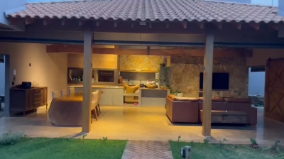 Área externa com churrasqueira gourmet, forno e piscina aquecida;